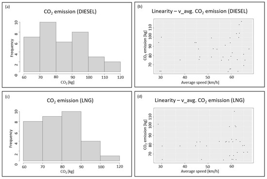 A descriptive statistical characterization of the data is shown in Table 3. Since we have only one independent variable and one dependent variable, we did not make tests for hidden relationships between variables. As can be seen at comparable mean values of velocity, the mean CO2 values are remarkably lower for the LNG vehicle. The same is shown by the median values. Additionally, the range of CO2 emission values is also narrower for the LNG.
