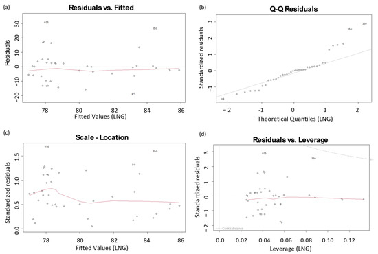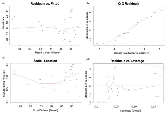 A detailed regression analysis was conducted on the database and the results are shown in Figure 6 for diesel and in Figure 7 for LNG. The results of the regression analysis show different preferences for the statistical analysis, such as non-linearity, the distribution of the random variable and heled identify influential cases, if there is any in the data analysis. Q-Q plots are in line with well-interpretable distributions as shown in Figure 4, allowing the use of regression analysis.