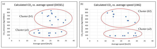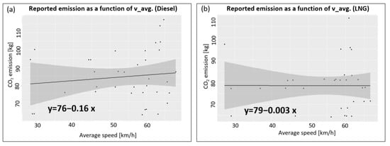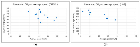 The final results of the statistical analysis shown in Figure 8. The figure represents the regression analysis outcomes, showing the reported emissions as a function of the average velocity values. A deviation in the gradients of the regression lines is apparent. The higher gradient for the diesel vehicle indicates the higher sensitivity of emissions to changes in average speed. From this perspective, the LNG-driven vehicle shows a more robust behaviour. This conclusion goes beyond the usual expected outcomes that higher speed results in higher emission. Although the change is not radical, it is still apparent.