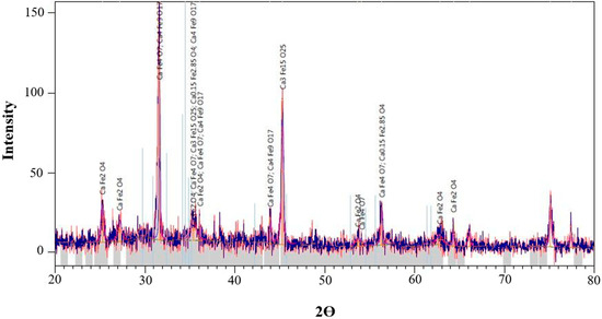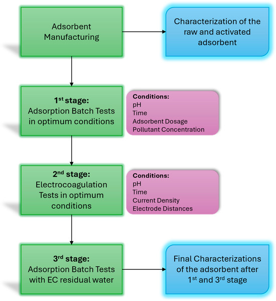 The process of remanufacturing the activated sand is used based on the authors’ previous studies [25,26]. A total of 100 mL of DI water containing 1.5 mL of HCl (32%) was mixed with two grammes of wastewater sludge ash and stirred at the speed of 200 rpm at room temperature for 180 min. Then, the solution was filtered via Whatman filter paper grade (1) at a diameter of 90 mm to collect calcium ions (Ca2+) dissolved in the clear filter solution, and the pH of this solution was adjusted to 12 using NaOH. Subsequently, a precisely measured 3.66 g of FeCl3 was added to the solution to attain a molar ratio of 1:0.75 between Ca2+ and FeCl3. A total of 3.66 g of quartz sand was added to the mixture, yielding a dose of 1 Sand: 1 FeCl3. A glass flask containing an appropriate volume (6 mL) of ethylene glycol was decanted and agitated at 200 rpm for three hours to create a layer of calcium ferric oxides on the sand’s surface. The mixture was then filtered to remove the sand and solution using the Whatman filter paper grade (1). After that, the resulting sand was dried for 12 h at 95 °C in an air-ventilated oven. The sand was then stored in a dry and clean glass bottle at room temperature for later use in batch tests. The experimental setup process is shown in Figure 2 below. As shown in the flowchart, the first step is manufacturing the adsorbent (CFO-SS); then, the first stage of the experiment is the adsorption batch experiment with the best conditions, the second is electrocoagulation with the best conditions, the third stage is the adsorption batch test with the residual water of the second stage, and finally, characterizations are performed for the adsorbent of the first and third stage and compared with the raw and activated sand.