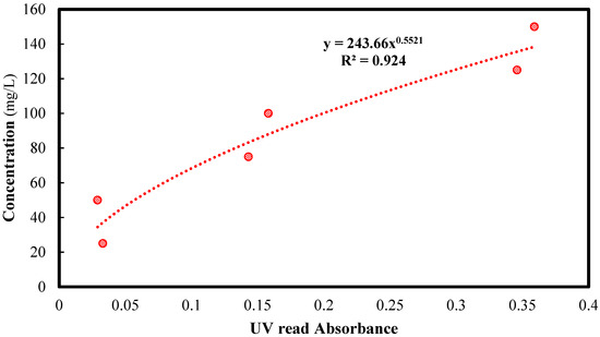 Initial concentrations (25, 50, 75, 100, 125, 150 mg/L) of Montelukast Sodium were contacted with 0.05 g of adsorbent (CFO-SS) and measured with the UV–vis spectrophotometer, and then the calibration curve was established using Microsoft Excel; the value of R2 was calculated for finding the removal efficiency of each experiment. The data reported in Figure 3 were fitted by a curve line, and the correlation coefficient at the highest level was found (R2 = 0.924). The high correlation coefficient of the calibration line observed in this study indicates that the absorptivity is consistent across the concentration range analysed, ensuring that the MS concentration can be determined with high precision [29].