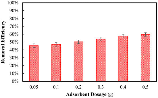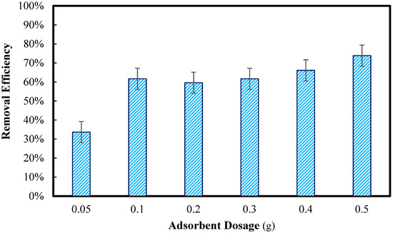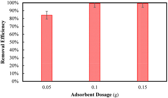 Compared to the previous studies, it can be concluded that the effect of adsorbent dosage could affect the adsorption capacity. In one study for the removal of chromium (Cr) from synthesised wastewater, removal efficiency improves first, reaches its maximum, and subsequently declines as adsorbent dosage increases while keeping all other parameters at fixed values; in this current study, the removal efficiency increased steadily with the increase in the adsorbent dosage [35]. In another study for the removal of Pb and Cd from the water, it was investigated that by increasing the adsorbent dose, the removal efficiency increased from around 75 to 90%, which showed the same increase as this current study [36]. In this study, the adsorbent performed better at higher dosages because more adsorption sites were available, enhancing the chances of capturing and removing the adsorbate from the solution.