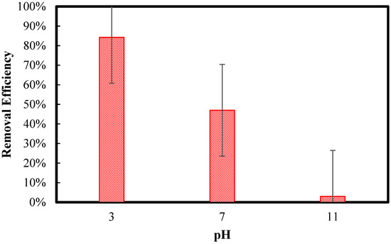 With the initial concentration of 50 mg/L and the same adsorbent dosage as the initial batch experiments, which was 0.05 g, and the best removal time, which was found at 120 min, the effect of pH was investigated. Three batch experiments were conducted with a pH of 3, pH of 7, and pH of 11 to determine the performance of the adsorbent in the acidic, neutral, and alkaline phases. Each experiment was conducted three times, and the validity of the results was approved. The result of the experiments is shown in Figure 5. Based on the results, the best performance of the adsorbent was found at a pH of 3, with a removal efficiency of 84%, which shows that the adsorbent is very efficient in the acidic phase.