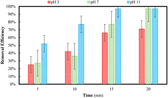 The electrocoagulation tests started with the effect of pH. For this purpose, a set of EC experiments were conducted in a pH of 3, 7, and 11. The initial pollutant concentration was 50 mg/L, and the distance between electrodes was adjusted to 5 mm. After 5, 10, 15, and 20 min, samples were taken out from the reactor, filtered with paper filter number 5, and measured with the spectrophotometer, and the results for the removal are shown in Figure 7.