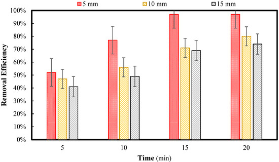 With the initial concentration of 50 mg/L and the pH of 11, a set of electrocoagulation tests were conducted to measure the effect of electrode distances. The same as the previous part, after 5, 10, 15, and 20 min and with 5, 10, and 15 mm distance between electrodes, samples measured with a spectrophotometer were filtered with the paper filter number 5, and the efficiency of work is shown in Figure 8.