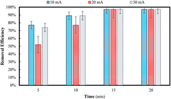 The next parameter investigated is the effect of current density on the removal efficiency of Montelukast Sodium (MS) from contaminated water. The C0 for this test was 50 mg/L, the pH was 11, and the distance between electrodes was adjusted to 5 mm. Similarly to the previous section, samples were filtered using paper filter number 5 and then measured using the spectrophotometer after 5, 10, 15, and 20 min of contact time and with 10, 20, and 30 mA current density, and the results are displayed in Figure 9.