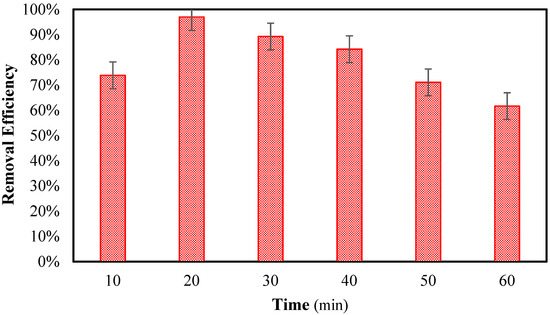 The final parameter tested in the electrocoagulation section was the effect of time. With the initial concentration of 50 mg/L, and after the best conditions were found, which included a pH of 11, current density of 20 mA, and distance between electrodes of 5 mm, the experiments for the effect of time after 10, 20, 30, 40, 50, and 60 min were conducted. The detailed results of the experiments (after three repetitions to validate the result) are shown in Figure 10.