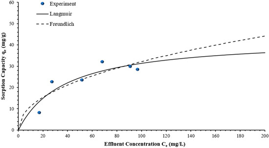 where qe is the amount of adsorbate adsorbed per unit mass of adsorbent at equilibrium (mg/g), qmax is the maximum adsorption capacity of the adsorbent (mg/g), KL is the Langmuir constant related to the affinity of binding sites (L/mg), and Ce is the equilibrium concentration of the adsorbate in the solution (mg/L).