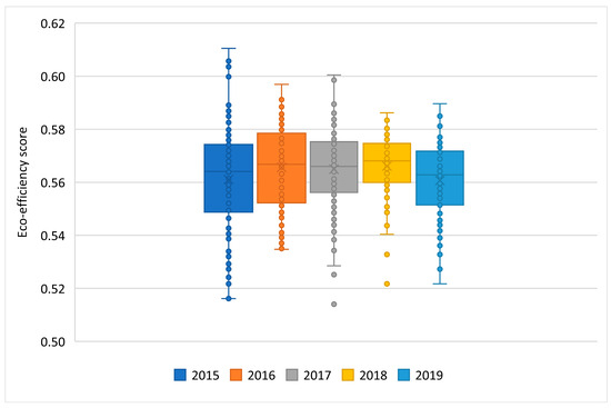The results of the eco-efficiency analysis of the municipalities over the years present a consistent trend, as depicted in Figure 2. The average eco-efficiency scores exhibit minimal variation, ranging from 0.561 in 2015 and 2019 to a slightly higher 0.566 in 2016, with an overall interannual average of 0.564. This indicates that, on average, there is a potential for improving economic and environmental performance by up to 43.6%. A notable observation from the results is the absence of any municipality achieving an eco-efficiency score of one, involving that all the municipalities assessed have the potential to enhance their eco-efficiency. This uniformity in scores, with the lowest observed eco-efficiency at 0.514 and the highest at 0.535, indicates a remarkable homogeneity in the economic and environmental performance across the 98 municipalities studied. The findings underscore a broader opportunity for systemic improvements in waste management practices across the assessed Chilean municipalities. The uniformity in eco-efficiency scores suggests that similar strategies for enhancement can be applicable across various municipalities, focusing on increasing recycling rates and optimizing waste collection and transportation. By addressing these areas, municipalities can work toward achieving higher eco-efficiency, leading to economic benefits and reduced environmental impacts.