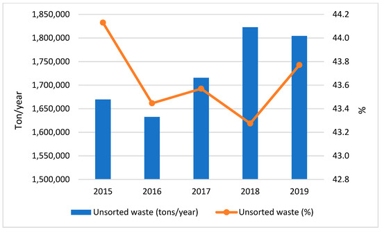 Potential reduction of unsorted waste expressed in tons per year and percentage in relation to total municipal solid waste generated.