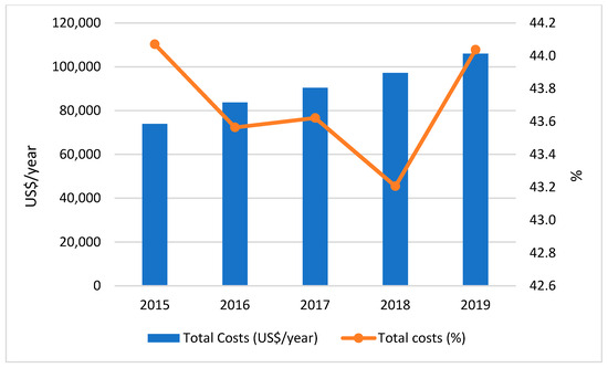 The inefficiency in MSW recycling among the 98 evaluated Chilean municipalities not only impacts environmental sustainability but also has significant economic implications. The potential reductions in unsorted waste, as depicted in Figure 3, indicate that if these municipalities achieved eco-efficiency, they can reduce unsorted waste by amounts ranging from 1,632,409 tons/year (2016) to 1,822,663 tons/year (2018). This reduction translates to 43.3% (2018) to 44.1% (2016) of the total MSW generated and collected, showcasing a substantial opportunity for waste diversion from landfills through enhanced recycling efforts. Moreover, the potential cost savings, as depicted in Figure 4, show an increasing trend from 2015 to 2019, peaking at a potential saving of 105,973 USD/year in 2019. This figure represents approximately 44% of the total MSW management costs for the 98 municipalities. Such substantial potential savings underscore the economic benefits of improving eco-efficiency in MSW management, alongside the environmental benefits of reducing unsorted waste.