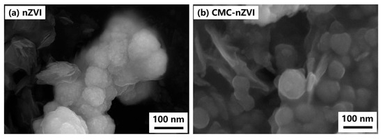 SEM images of (a) nZVI and (b) CMC−nZVI.