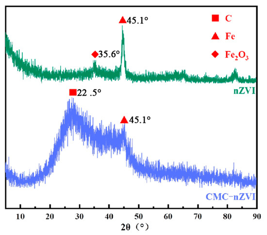 Figure 2 shows the XRD profiles of nZVI and CMC−nZVI. nZVI and its CMC−modified counterpart both displayed diffraction patterns associated with the BCC lattice of the α−Fe phase, specifically the (110) crystallographic plane, which is indicative of iron in its zero−valent state being the predominant constituent, characterized by distinctive peaks within the 2θ range of 45 °~46°. The peak of Fe2O3 appeared in the nZVI spectrum, indicating that some of the nZVI has been oxidized during the sample preparation. The effective inclusion of the carbon−containing polymeric substance CMC was demonstrated by the development of the C peak in the CMC−nZVI spectrum. Furthermore, the Fe0 peak in the CMC−nZVI spectrum was not distinct, which was due to the incorporation of organic matter.