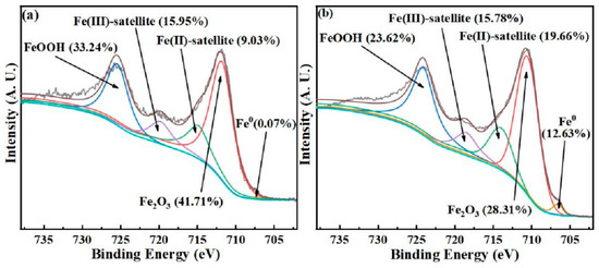 Figure 3 illustrates the XPS patterns of nZVI and CMC−nZVI. Both materials have five forms of iron: FeOOH, Fe(III), Fe(II), Fe2O3, and Fe0. The total percentage of Fe2+ and Fe0 in CMC−nZVI was 32.29%, and the total percentage of Fe2+ and Fe0 in nZVI was only 9.10%, which was 23.19% higher than bare nZVI. The Fe0 content rose from 0.07% to 12.63%, suggesting that the CMC coating decreased the oxidation of nZVI.