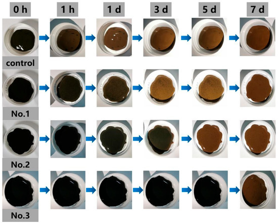Variants of CMC−nZVI, each with distinct coating ratios, were synthesized employing the liquid−phase reduction method. They were labeled as control samples, sample No. 1, sample No. 2, and sample No. 3 (MCMC:Miron = 0:1, 0.5:1, 1:1, and 2:1, respectively). The four materials were placed in different vessels, and six time periods of 0 h, 1 h, 1 d, 3 d, 5 d, and 7 d were photographed to observe the oxidation of each group.