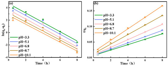 (a) Pseudo−first−order kinetics model and (b) pseudo−second−order kinetics model.