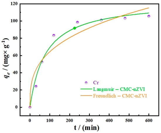 Given the significant effect that pH has on the removal of Cr(VI) by CMC−nZVI, an adsorption kinetics analysis was conducted with pH as a variable. Appropriate parameters were obtained from the pseudo−first (4) and pseudo−second (5) order kinetic models. The results of the kinetic model fitting are depicted in Figure 6, while the parameters derived from kinetics at varying initial pH values are detailed in Table S2. Comparing the data of the pseudo−first and the pseudo−second−order kinetic model, the latter had a correlation coefficient between 0.997 and 0.998. Since the actual value of Qe was comparable to the theoretical value, and the kinetic model matched the pseudo−second−order kinetics well, the removal of Cr(VI) from soil by CMC−nZVI was a chemisorption process that included both chemical reduction and physical adsorption. This process is determined by two factors: one is determined by electron transfer and valence bonding forces, and the other is determined by physical diffusion [34]. Figure 7 illustrates the fitting results of the adsorption isotherm curve model. The parameters obtained from the isothermal adsorption model under different initial concentrations are shown in detail in Table S3. In contrast to the Freundlich isothermal adsorption model, the Langmuir isothermal adsorption model had an R2 greater than 0.95. Compared to the Freundlich model, it is more accurate in describing the adsorption process. At 123.465 mg·g−1, the qm value was more in line with the experimental value. This suggests that the monolayer homogeneous chemical adsorption occurred at locations on the CMC−nZVI surface and that no communication occurred between the adsorbate molecules. Combined with Table S2, it can be known that removing Cr(VI) from the soil by CMC−nZVI is a chemical adsorption process. In comparison to other materials, CMC−nZVI has been observed to have a greater adsorption capacity for Cr(VI) removal. This can be attributed to the distinctive nature of the nZVI material and the CMC loading of nZVI.