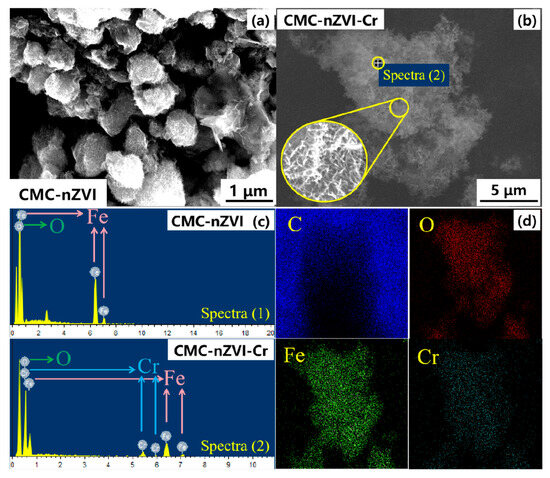 (a) SEM images of CMC−nZVI and (b) CMC−nZVI−Cr and (c,d) EDS images of CMC−nZVI−Cr. In (d), the blue color represents the C element, the red color represents the O element, the green color represents the Fe element, and the cyan color represents the Cr element.