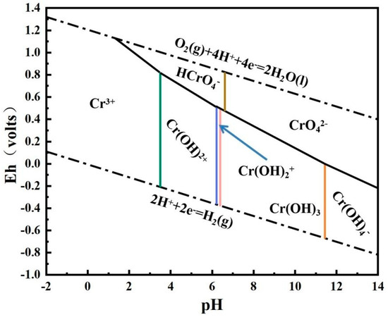 Both the kinds of metal ions that are present in the soil and the effectiveness of CMC−nZVI are significantly impacted by pH. This also has a significant impact on the removal of metal ions. The Cr−O2−H2O system’s E−pH diagram is shown in Figure 10. HCrO4− and CrO42− are the predominant forms of Cr(VI) in the pH ranges of 2~6.47 and 6.47~14. Under acidic conditions, Fe0 is more easily oxidized to Fe(II) or Fe(III), releasing electrons. Chromate anions, such as HCrO4−, CrO42−, and others, acquire electrons in the soil, converting Cr(VI) to Cr(III) (Equations (6)–(9)). But in alkaline circumstances, a lot of OH− causes hydroxide precipitates of Fe(II), Fe(III), and Cr(III) to form (Equations (10)–(12)). These precipitates cover the surface of nZVI to stop electron transfer and lower its activity. Meanwhile, the complex precipitation of Fe(III) and Cr(III) forms (Equations (13) and (14)). These complexes are extremely stable and are not easily re−dissolved into the ionic state so that the heavy chromium metal can be effectively removed. Since the materials used for characterization are involved in the reaction under weakly alkaline conditions, a hydroxide complex of iron−chromium is present in the characterization results.