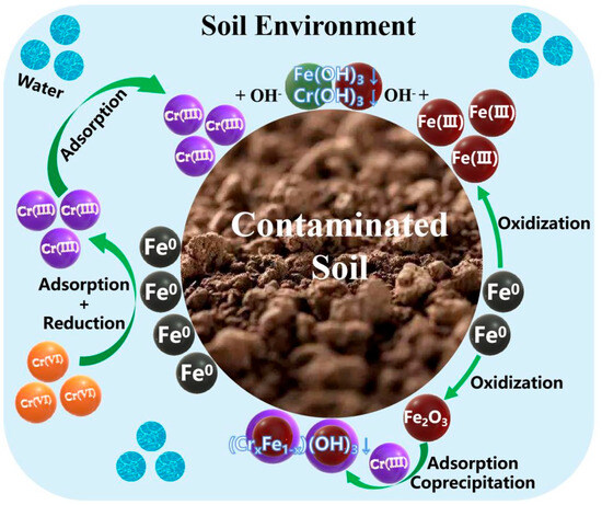 Rapid economic development is often accompanied by industrial damage to the environment, which results in severe contamination of soil resources, such as heavy metal pollution. In particular, high chromium concentrations are found in factories in the electroplating, textile, and metallurgical industries [1]. Moreover, trivalent chromium and hexavalent chromium are commonly used in industry, making chromium in contaminated soil present in these two valence forms [2]. Many nations and areas consider Cr(VI) to be one of the priority pollutants [3,4]. Under natural conditions, Cr(VI) exists in a stable and crystalline form with high stability. In polluted soils, the leachability of Cr(VI) is greatly increased, facilitating its entry into the ecosystem and accumulation in plants, notably crops, via soil migration, thereby endangering human and animal health [5]. It would seem, then, that the pollution management of Cr(VI), a heavy metal in the soil, has become an urgent environmental problem.