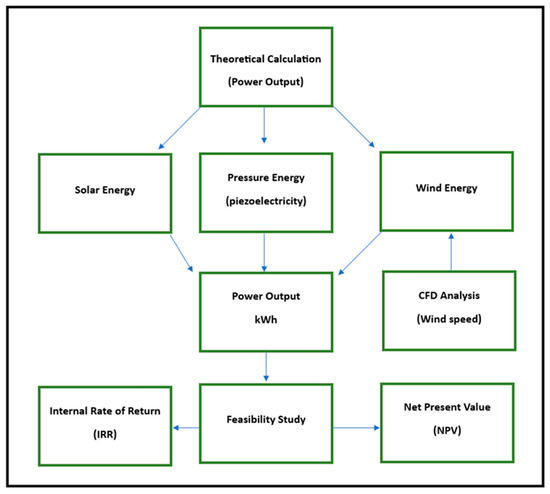 The main stages of analysis explaining theoretical modeling conducted for solar panels, mini-wind turbines, and piezo materials based on the power output of both NPV and IRR. This is calculated to determine the feasibility of such projects.