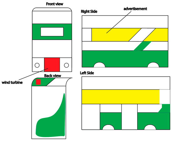 Figure 4 illustrates the layout of the bus where the solar panels and wind turbines are located. The design identifies that the green parts are dedicated to the solar panels, and the red part in the front is for locating the mini-wind turbine.