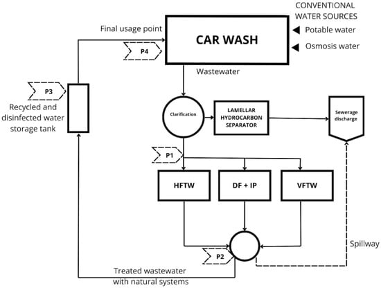 Vehicle Washing Facilities (VWFs) are common in urban areas worldwide, particularly in high-income countries, where they consume significant amounts of tap water and electricity and produce large volumes of wastewater with harmful compounds. The automotive industry, specifically carwash stations, utilizes approximately 60–70 L of water per vehicle, with variations depending on the vehicle size, level of dirt, and washing mechanism (manual or automatic) [1,2]. This high water consumption generates an average of 150–600 L of wastewater weekly, presenting significant environmental and economic concerns. In manual washing operations, daily wastewater production can reach 400 L, while programmed dosing facilities reduce this to around 150 L, depending on efficiency [3]. Despite increasing regulatory pressures, many carwash stations fail to comply with freshwater preservation and management regulations, necessitating the adoption of sustainable water reuse technologies [4].