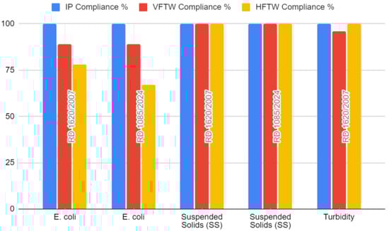The compliance of all three systems—IP, VFTW, and HFTW—with the reuse standards set by RD 1620/2007 [47] varied across the measured parameters (Figure 3). Both the IP and HFTW systems consistently met the standards for SS and turbidity, achieving full compliance with turbidity levels below 10 NTU and SS levels under 20 mg/L. However, in the case of E. coli, the HFTW system demonstrated reduced compliance due to its lower microbial removal efficiency, achieving only less than 80% compliance as a result of its lower Ulog removal rates. The VFTW system showed high compliance across most parameters but faced challenges with E. coli and turbidity compliance during high hydraulic loads (80 cm/day). In contrast, the IP system demonstrated the highest overall performance, with 100% compliance across all parameters, showcasing its superior efficiency in water treatment for reuse applications.