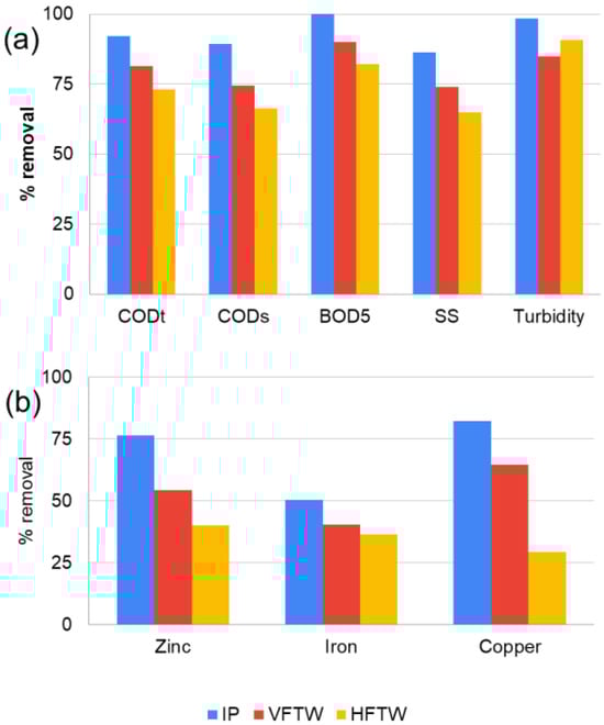 Percentage Removal Efficiency of the pilot plants: IP: Infiltration-percolation system; VFTW: vertical-flow treatment wetland; HFTW: horizontal-flow treatment wetland. (a) Key Parameters: CODt: COD total; CODs: COD soluble; BOD5; SS; Turbidity. (b) Metals: Zinc, Iron and Copper.