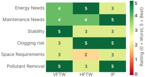 This figure (Figure 5) provides a comparative ranking of three NbS systems studied for car wash wastewater treatment. Each system is rated from 0 (least favorable) to 5 (most favorable) across attributes like maintenance requirements, performance stability, and space needs, to give a perspective on NbS efficacy relative to other treatment methods.