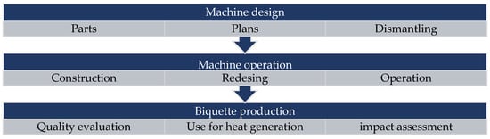 The methodology proposed for this research is based on the implementation of appropriate technology through a participatory design [], with the identification of priority energy needs, eco-technological development, and implementation processes [,]. The integration of the described socio-techno-environmental aspects is crucial to contribute to the successful functionality and operation of the proposed technology. Figure 1 shows a flow chart describing the stages of the methodology used, integrating the development, evaluation, and redesign of the technology. This methodology consists of 3 stages, with interactions between them. The first stage captures the idea of the device through Computer Aided Design (CAD). This stage comes from the previous participation of the users; the second stage is related to the operation and redesign of the machine, and finally, the last stage is related to the production and evaluation of the briquettes.