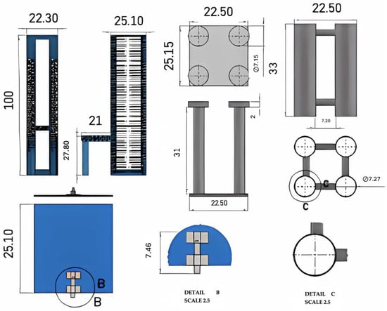The design of the machine, specifically the molding tubes for producing the briquettes, is one of the main components used in the production of biomass briquettes. The proposed briquette molding unit can produce 4 cylindrical pieces in one pressing. Each briquette has an approximate diameter of 7.2 cm with a length of 9 to 10 cm. The internal perforation of the briquettes is performed after drying, generating an internal diameter of 1 cm at the center of the circular surface, which allows for improving the different stages of combustion (drying, pyrolysis, gasification, and combustion) []. The machine consists of three main parts: mold, cover, and mechanical jack.