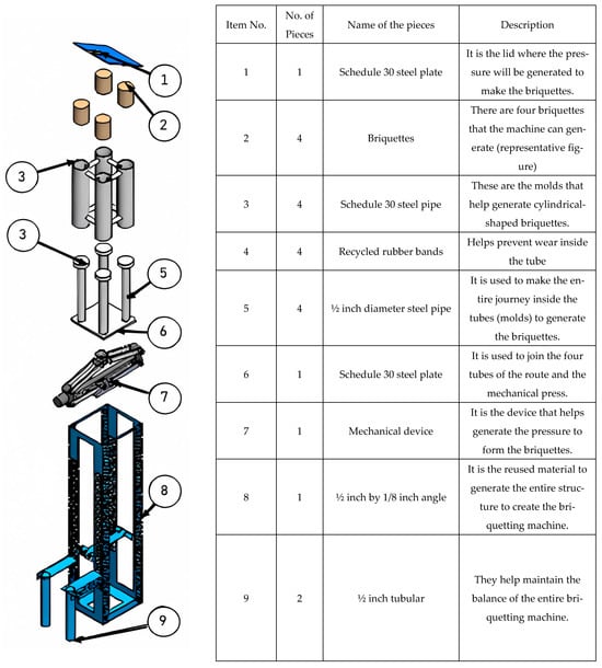 Figure 4 shows the number of parts and their function. The most important elements are described below: one steel plate where the pressure for the briquettes is generated, four briquettes (representative images), four steel tubes that help generate the cylindrical briquettes, four recycled rubber bands to prevent friction inside the tubes, four steel tubes that form the axis for compaction, one mechanical device that serves to generate the pressure for compacting the mixture, and a metal structure (½ inch by 1/8 inch angle) that makes up the entire structure of the machine.