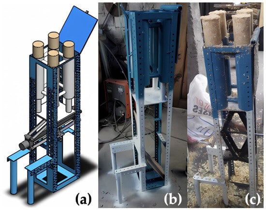The second stage of this design involves the construction of the machine, fully integrating the technical part and low impact on the environment due to the construction materials. The machine was built using the eco-design method, which reflects the energy needs of the users [,]. The machine was constructed primarily from recycled steel components; the machine only requires manpower to manipulate the mechanical system. Figure 5 presents the development process of the briquetting machine, from its conceptual, functional design to its operation. Figure 5a shows the complete design of the equipment modeled in computer-aided design (CAD) software, where the structural and mechanical components of the machine are defined. Subsequently, Figure 5b shows the physical construction of the prototype, evidencing the transition from the digital model to a tangible structure through the manufacturing and integration of its elements. Finally, Figure 5c illustrates the machine in operation carrying out the production process of solid biofuels (briquettes).
