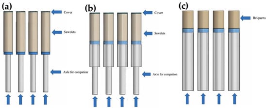 (a) placement of the sawdust in the molds, (b) compaction of the mixture, (c) generation of the briquettes.