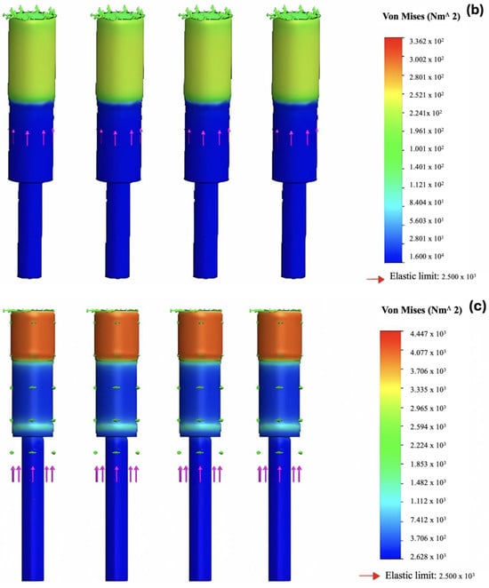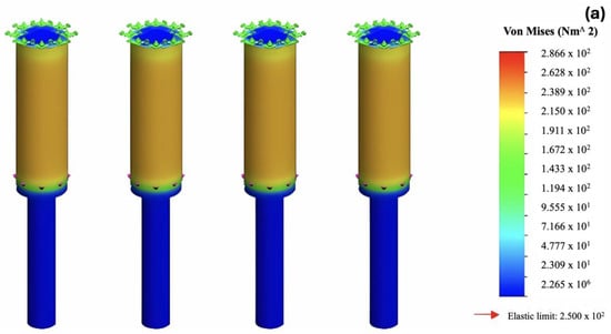 - In the simulation performed with SolidWorks, the Von Mises stress presented a deformation range that varied between a minimum value of 2.628 × 10−3 N/m2 and a maximum of 2.500 × 108 N/m2. On the other hand, the calculated equivalent unitary strain (ESTRN) showed minimum values of 1.019 × 10−14 and maximum values of 1.845 × 10−8;