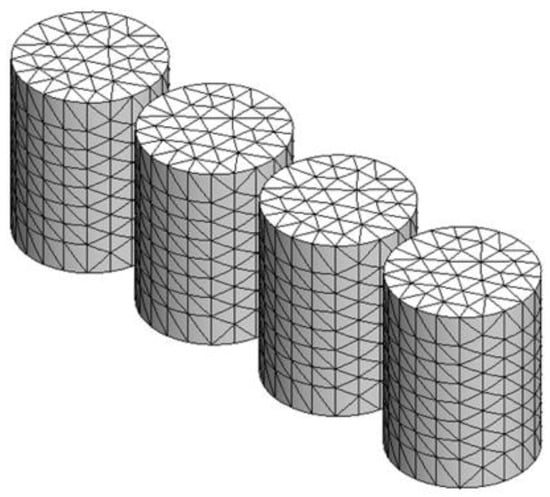 The compaction analysis was performed considering a time of 10 s, corresponding to the period during which the mixture of sawdust and components remains inside the tube for compaction. This analysis shows different mechanical stresses for different phases. Figure 7a shows the Von Mises strain stress, where the minimum strain found was 2.265 × 10−6 N/m2, and the maximum strain was 2.866 × 102 N/m2. The equivalent unit strain (ESTRN) showed a minimum strain of 9.692 × 10−18 and a maximum of 1.177 × 10−9. Figure 7b also shows the Von Mises strain stress, with a calculated minimum strain of 1.600 × 10−6 N/m2 and a calculated maximum strain of 2.500 × 108 N/m2. Regarding the ESTRN, the minimum calculated strain was 1150 × 10−15, and the maximum calculated strain was 1279 × 10−9. For the case shown in Figure 7c, the minimum Von Mises strain was 2628 × 10−3 N/m2, and the maximum strain was 2500 × 108 N/m2. The ESTRN showed a minimum calculated strain of 1019 × 10−14 and a maximum strain of 1845 × 10−8. Finally, a model was implemented to analyze the fall of the briquettes, considering conditions such as height (2 m), impact surface (cement), briquette material (sawdust), and gravity (9.81 m/s2) []. The model mesh was adjusted by convergence to achieve independence of the results with respect to the mesh size. The appropriate size for the simulations was determined to correspond to a mesh of 11,733 elements with 12,613 nodes, as shown in Figure 8.
