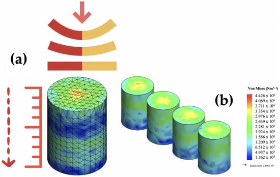 The simulation presented in Figure 10a shows the distribution of equivalent stresses as a function of the impact angle. This distribution maintains an approximately constant shape in the four briquettes, regardless of the launching height (2 m). Figure 10b shows the stresses decomposed into the radial, tangential, and longitudinal directions within the simulation reference frame, resulting in stresses distributed along these orientations. The resulting displacements (URES) associated with this effort present values that vary between a minimum of 7.392 × 10−1 mm and a maximum of 7.857 × 10−1 mm. The stresses during the 90° impact also depend on the impact force review, with the radial and tangential directions being the main ones. The tangential component favors the distribution of the total impact stresses along the curved surface of the briquette, generating a lower equivalent stress similar to the behavior of an arch. The effect of orthotropic properties, which modify the resulting stresses, is relevant.