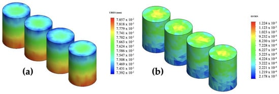 Figure 11 shows the deformation on the base face of the four briquettes; the ESTRN (Equivalent Unit Strain) shows a minimum deformation of 2.178 × 10−5 and a maximum distribution of 1.224 × 10−3. Finally, a complete mesh (see Figure 12) of the four briquettes is shown with a section cut out to know the greater impact of deformation inside the briquettes.