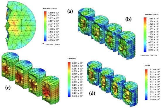 Each of the analyses shows the deformation represented in a color bar, in which the blue color results in a minimum effort, and the red color results in a maximum effort that occurs in the internal part at the time of a fall. Figure 12b shows the VON analysis that resulted in a minimum internal stress of 8.458 × 104 N/m2 and a maximum of 2.168 × 106 N/m2. Figure 12c shows the URES analysis, which resulted in a minimum of 8.076 × 10−1 mm and a maximum of 8.425 × 10−1 mm. Finally, Figure 12d shows the ESTRN analysis, which resulted in a minimum internal stress of 1.840 × 10−5 and a maximum of 6.110 × 10−4. Finally, according to these analyses, the greatest compaction of the four briquettes is found in the center. This result may be due to factors such as porosity effects not considered since the simulation considers a mainly linear elastic model. This analysis provides us with information to know the impact that the briquettes may have with a fall, especially in the transport stage, once these briquettes begin to be marketed.