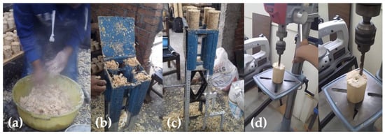 The mixtures used for the production of briquettes were cited by Vera-Velásquez [], who reported the use of 230 g of starch, 500 mL of water, and 1 kg of cassava for the manufacture of a briquette with a diameter of 5.08 cm and a length of 5 cm, generated by manual pressure. In this research, cassava was replaced by local wood waste and starch by corn starch, using 1 L of water. For the manufacture of briquettes using the proposed machine design, which has the capacity to produce four briquettes in a single operation cycle, a specific mixture of materials is used. The formulation consists of 1 L of water, 300 g of wood waste, which can be sawdust, shavings, or a combination of both in equivalent proportions, and approximately 310 g of corn starch as a binder. These components are mixed until a homogeneous mass is obtained, as shown in Figure 12a. Considering that the total mixture is distributed equally among the four briquettes, it is estimated that the amount of material used per unit is approximately 0.25 L of water, 75 g of wood residue, and 77.5 g of corn starch. This is the mixture necessary for the production of a briquette of 7.2 cm in diameter and an average length of 9 to 10.5 cm. This method not only corroborated the data of Vera-Velázquez [] but also increased the amount of briquettes manufactured. After making and drying the briquette, a hole was made in the center of the briquette. Figure 12 presents the complete briquette production process, from the preparation of the base mixture to the final drilling to optimize its combustion. Figure 12a shows the mixing process of the materials necessary to obtain a homogeneous composition suitable for the manufacture of briquettes. Subsequently, Figure 12b shows the placement of the prepared mixture at the bottom of the tubes of the briquetting machine, ensuring that the material completely fills the conduits to their limit before compaction. Figure 12c illustrates the machine in operation, showing the production of four briquettes simultaneously. Finally, Figure 12d shows the drilling stage in the center of the briquettes using a drill, with the purpose of improving combustion efficiency by allowing for greater airflow during its use as biofuel (the drilling is additional)