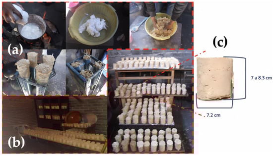 The generation of wood waste from the Pichátaro community consists of sawdust and shavings; corn starch is used as a binding material, which is commonly used in the locality due to a region with the greatest diversity of native corn in the country []; sawdust (250 g), shavings (250 g), corn starch (310 g), and water (1 L) were used [].