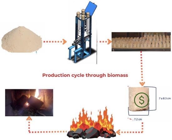 Table 1 presents the unit production cost for the manufacture of briquettes, estimated and reported in previous research []. In this analysis, the information has been updated with the prices corresponding to the year 2025. It is important to highlight that the calculation of the production cost considers only the value of the raw material, without including the costs associated with labor individually, but it is reported in the results section from a prospective working day.