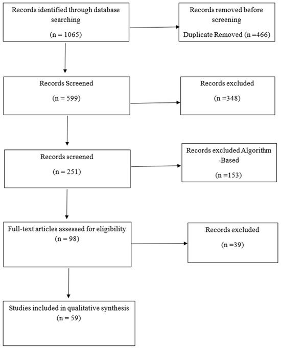 In the initial screening, we reviewed 1065 articles. To avoid redundancy, duplicate records identified across multiple databases were removed, ensuring that each study was only reviewed once; we removed 466 duplicates. Next, the titles and abstracts of the remaining articles were screened, leading to the exclusion of 348 articles that did not align with our focus.
