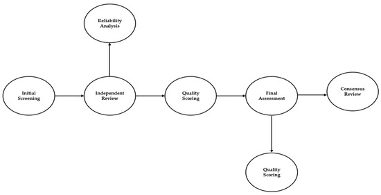 Figure 2 illustrates the flow from initial screening to final assessment, which then leads into specific quality checks like Reliability Analysis, Validity Testing, and Bias Assessment. The diagram highlights the sequential steps taken to ensure a thorough and reliable evaluation of the studies.