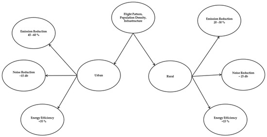 Figure 3 has two primary branches, representing the Urban and Rural environments. Each is connected to specific outcomes related to emissions reduction, energy efficiency, and noise impact. Urban areas achieve a more significant reduction in emissions than rural areas, likely due to more efficient transportation and industrial practices. Urban areas see a more significant improvement in energy efficiency, perhaps driven by better infrastructure and technology adoption. While noise levels decrease, the reduction is less than in rural areas, possibly due to higher activity levels and population density. The reduction in emissions is more modest in rural areas, likely due to lower industrial activity and less intensive interventions. Efficiency improvements are positive but smaller than in urban areas, reflecting potentially less advanced infrastructure. Rural areas experience a more significant reduction in noise impact, possibly due to lower population density and less overall human activity. Population density, infrastructure, and flight patterns are common factors influencing urban and rural outcomes. These factors play a crucial role in shaping each area’s environmental characteristics. For example, higher population density in urban areas might drive the need for more significant energy efficiency improvements, while rural areas benefit from less dense populations regarding noise reduction. The diagram illustrates the interplay between these factors and highlights how the same influences can result in different environmental benefits in urban versus rural settings. It emphasizes the complexity and variability in achieving environmental impact across different regions.