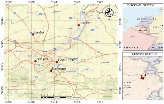 DSS samples were collected from five WWTPs around the city of Liège, Belgium: Embourg (S1), Lantin (S2), Grosses-Battes (S3), Sclessin (S4), and Oupeye (S5). Each sample was stored at 4 °C throughout the experimental period to prevent biochemical activity and loss of integrity. The geographical layout of these WWTPs is illustrated in Figure 1.