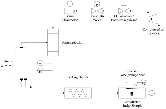 The dryer is illustrated in Figure 2 and consists of two main components: the air conditioning and feeding system, and the drying chamber. Compressed air is supplied from the laboratory network, with its flowrate regulated by a pneumatic valve connected to a mass flowmeter. The air can be humidified by introducing steam from a generator, heated to the desired temperature via a heating channel, and subsequently directed into the drying chamber.