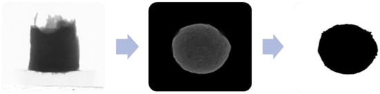 The drying exchange surface and volume of sludge samples were measured using the methodology developed by A. Léonard (2002) [28]. During the experiments, the samples were periodically removed from the dryer chamber and placed about 2 min into a Skyscan-1074 X-ray scanner (Skyscan, Ghent, Belgium) in order to obtain images of several cross-sections. This procedure was repeated approximately ten times without affecting the drying kinetics. The obtained images, with a pixel size of 41 μm, were reconstructed using the Skyscan/NRecon V1.7.4.2 software. Matlab 2024® software was subsequently used to determinate the average equivalent diameter [mm] and average height [mm] and finally calculate the surface area of the sample. The obtained data were used to generate the Krischer’s curve of DSS drying.