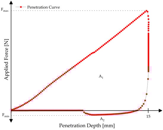 The penetration test, as described in the methodology, consists of a two-phase cycle: compression (loading) and decompression (unloading). This test is critical for evaluating the mechanical properties of the dehydrated sewage sludge (DSS) samples [20,32]. Figure 4 shows the standard penetration curve obtained in this type of experiment, and the mean values of adhesiveness and cohesiveness are shown in Table 3.